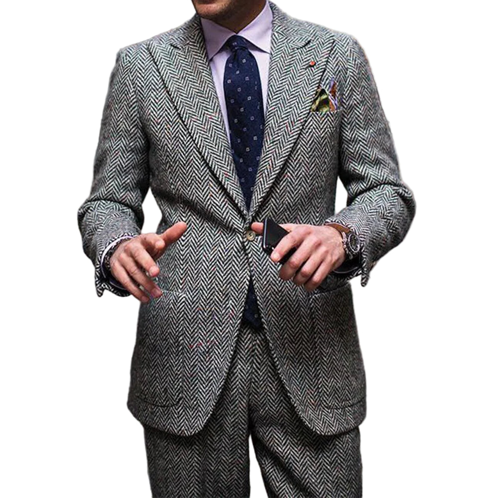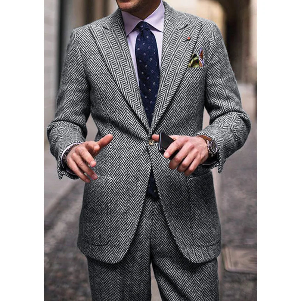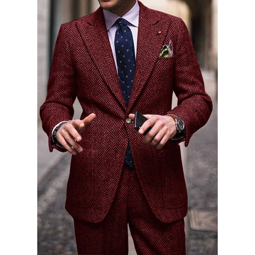 This men's two-piece suit features a classic herringbone pattern combined with a slim-fit design that balances comfort and style. The notch lapel and single-breasted front give it a refined appearance suitable for both business and formal occasions. Tailored to provide a comfortable waist fit, this suit offers a polished, elegant look ideal for professional and casual settings alike.