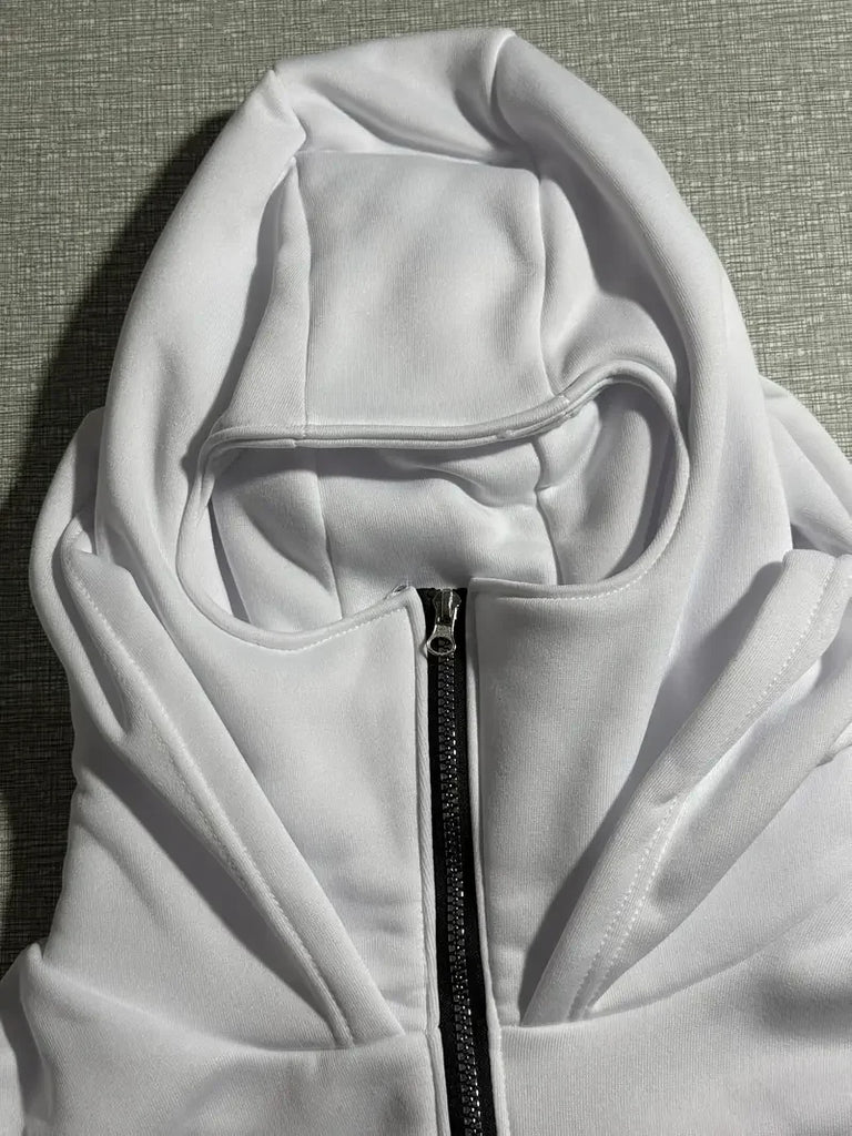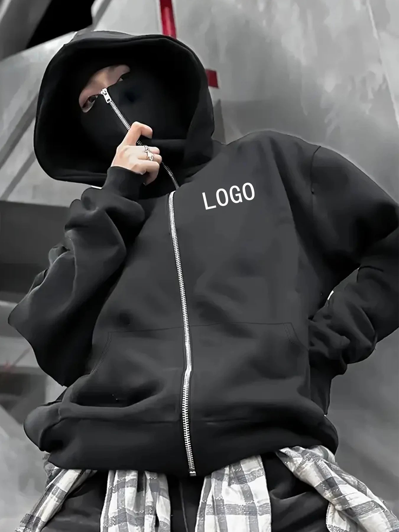 Elevate your streetwear with these insulated double-hooded sweatshirts, designed for both style and warmth. Featuring a trendy masked zip-up design, they offer unique coverage and a modern look. Personalize your hoodie with the logo of your choice to create a truly distinctive piece that reflects your brand or personality while ensuring comfort and practicality in cooler weather. Perfect for those seeking functional fashion with a customizable edge.
