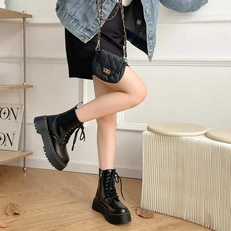 # VOOODIEX Minimalist Lace-up Women Boots Elevate your everyday style with these British-inspired lace-up boots, engineered for both comfort and presence. The 5cm chunky heel paired with a substantial platform sole delivers a confident height boost while maintaining stability on any surface. Crafted with a minimalist aesthetic, these boots feature a thick sole construction that withstands daily wear and provides superior support. The lace-up design offers adjustable fit and a timeless silhouette that transitions seamlessly from casual outings to weekend adventures. Perfect for those seeking understated sophistication with functional design.