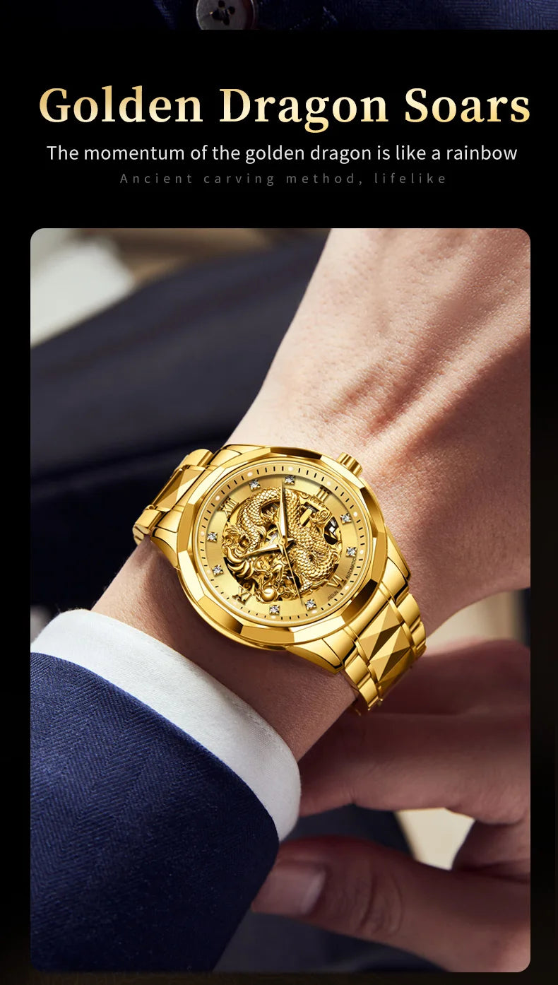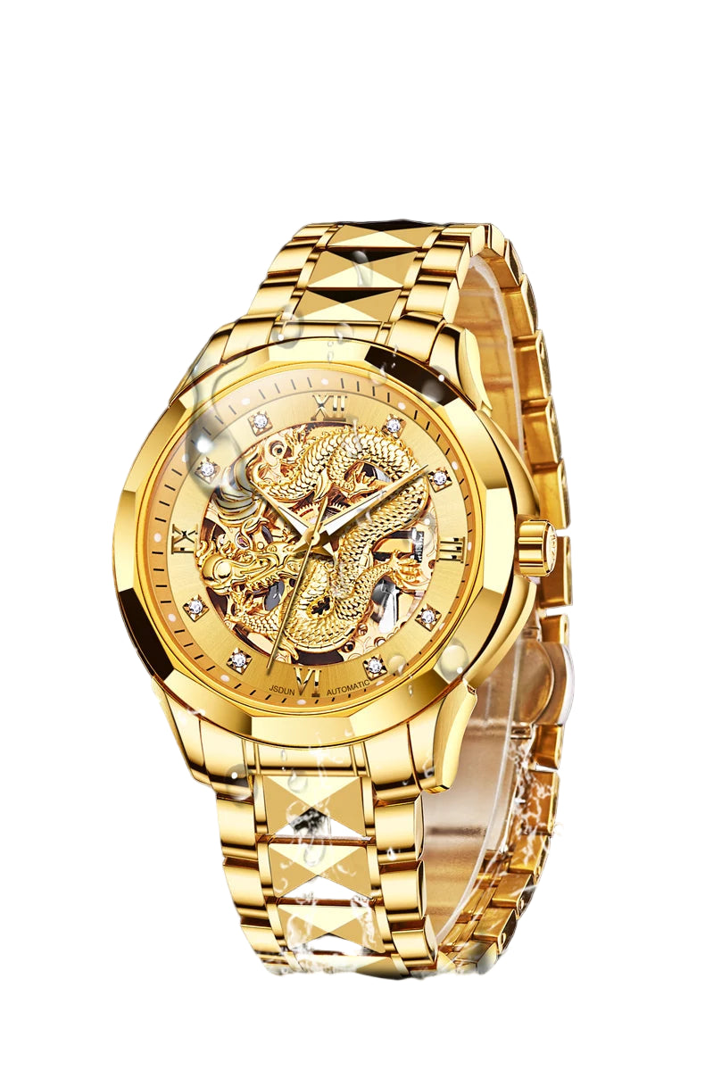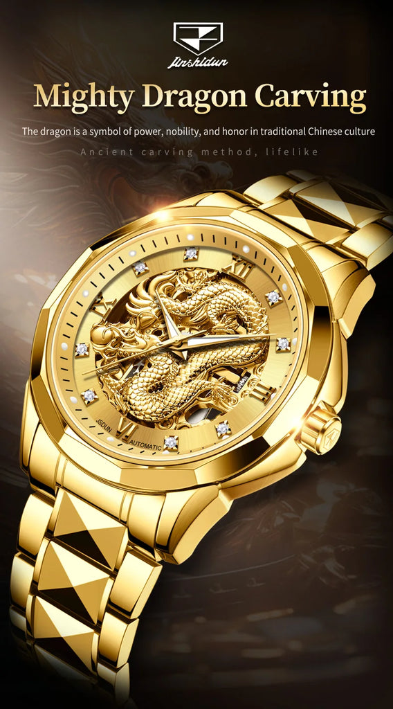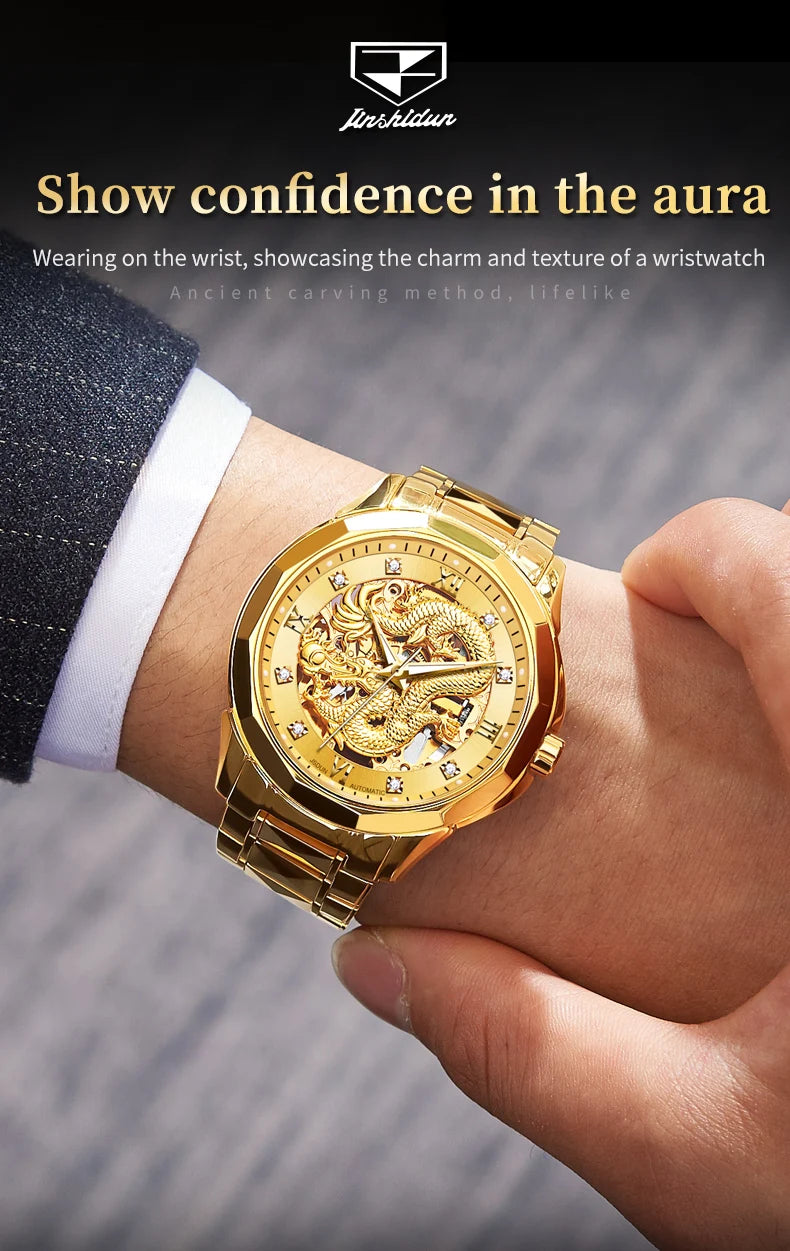 JSDUN 8840 Men Watch Luxury Hollow Gold All Dragon Carving Watch Diamond