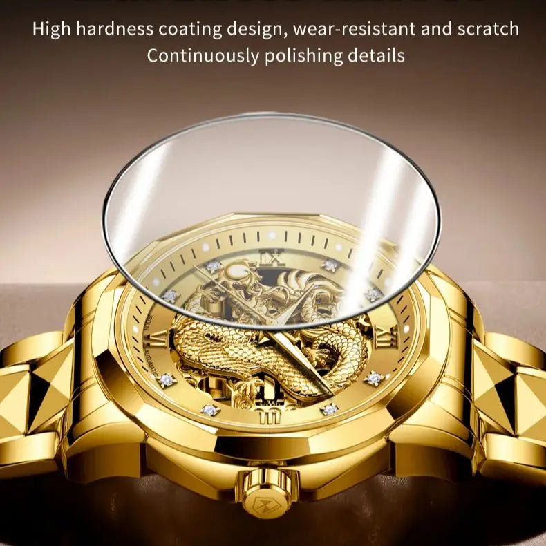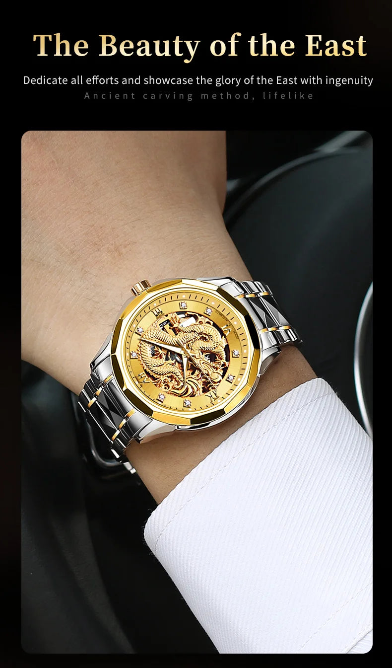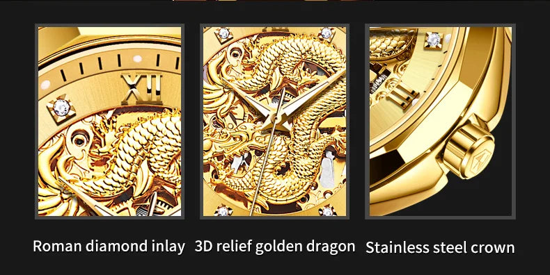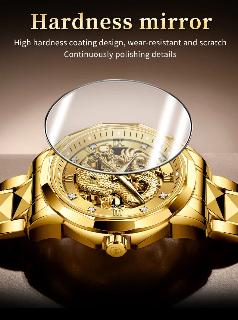 JSDUN 8840 Men Watch Luxury Hollow Gold All Dragon Carving Watch Diamond