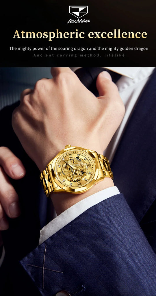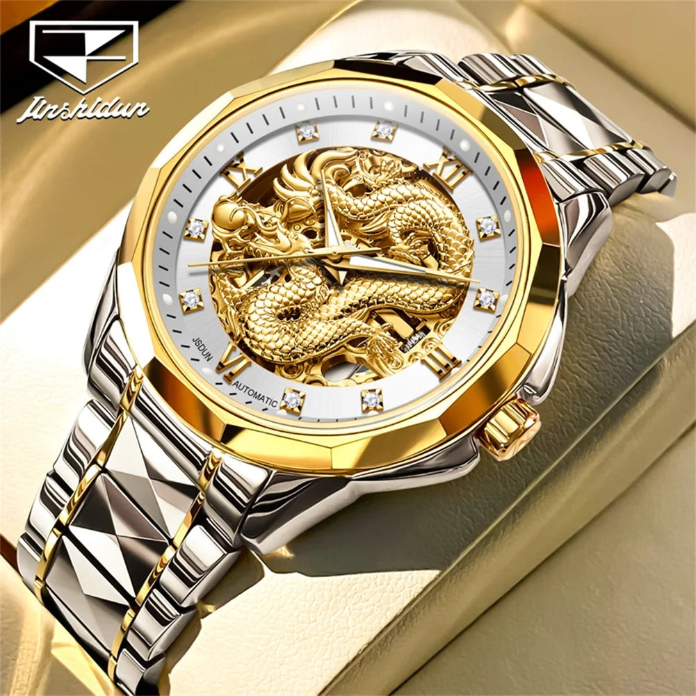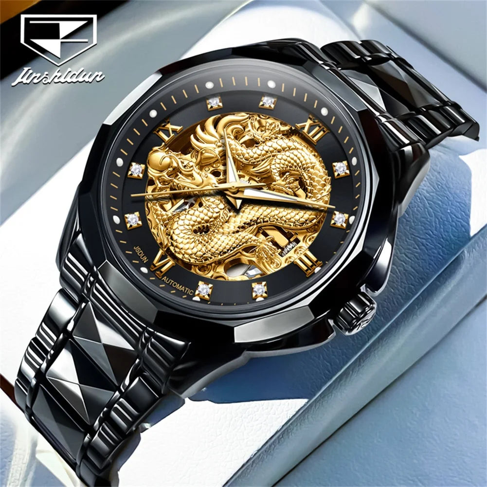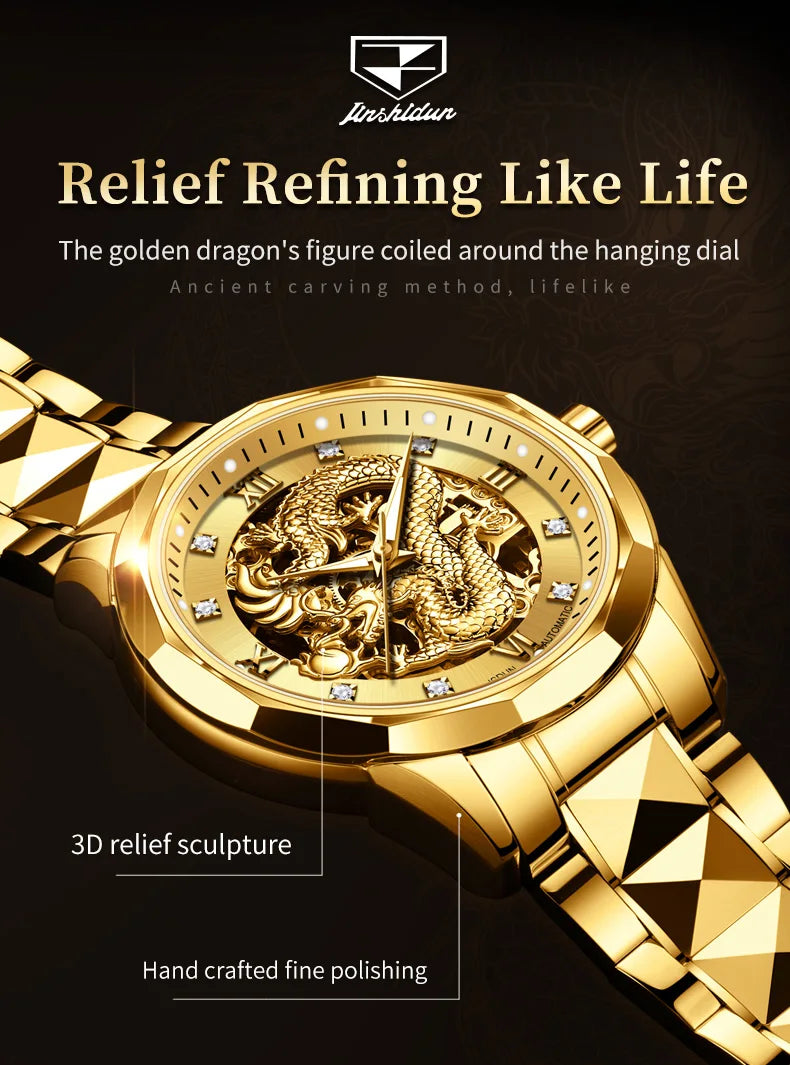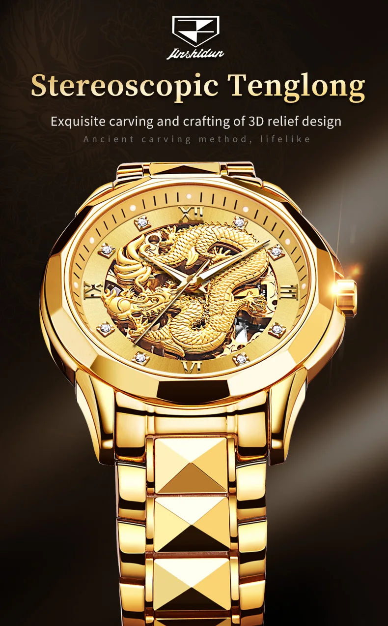 The JSDUN 8840 represents the pinnacle of mechanical watchmaking, combining traditional craftsmanship with contemporary luxury design. This automatic timepiece features intricate all-over dragon carving in hollow gold, creating a striking visual statement that captures light and movement. The diamond-set bezel and case elevate its prestige, while the transparent exhibition caseback reveals the precision of the automatic mechanical movement within. Engineered for discerning collectors, this original men's brand watch delivers both horological excellence and artistic distinction, making it an investment piece that transcends everyday timekeeping.