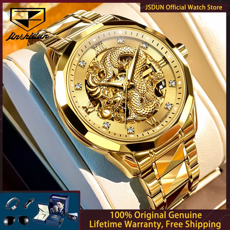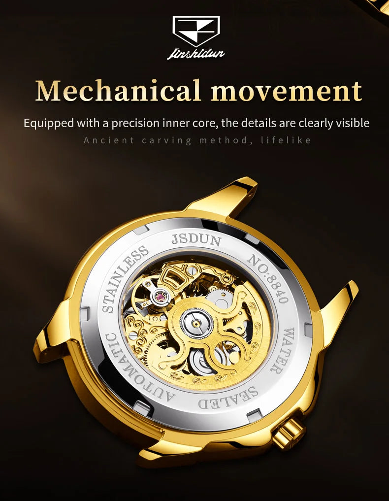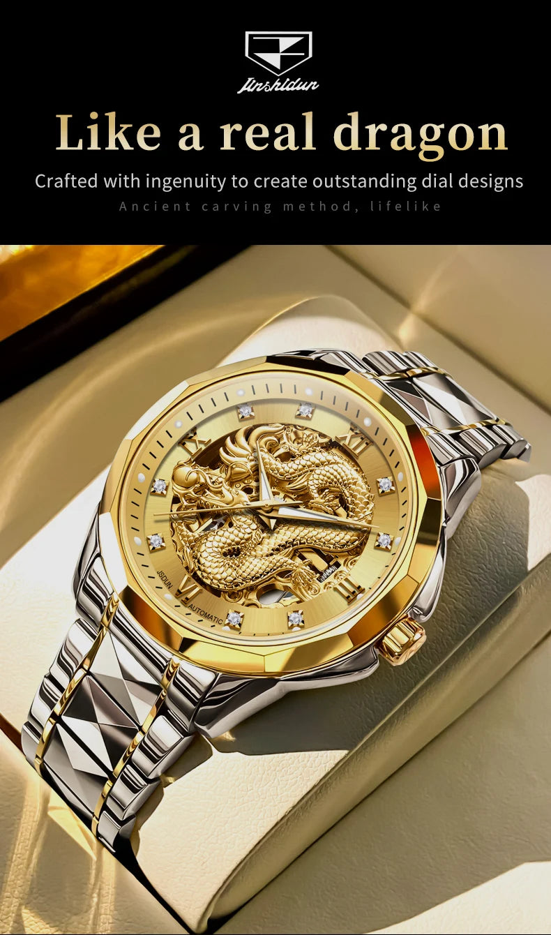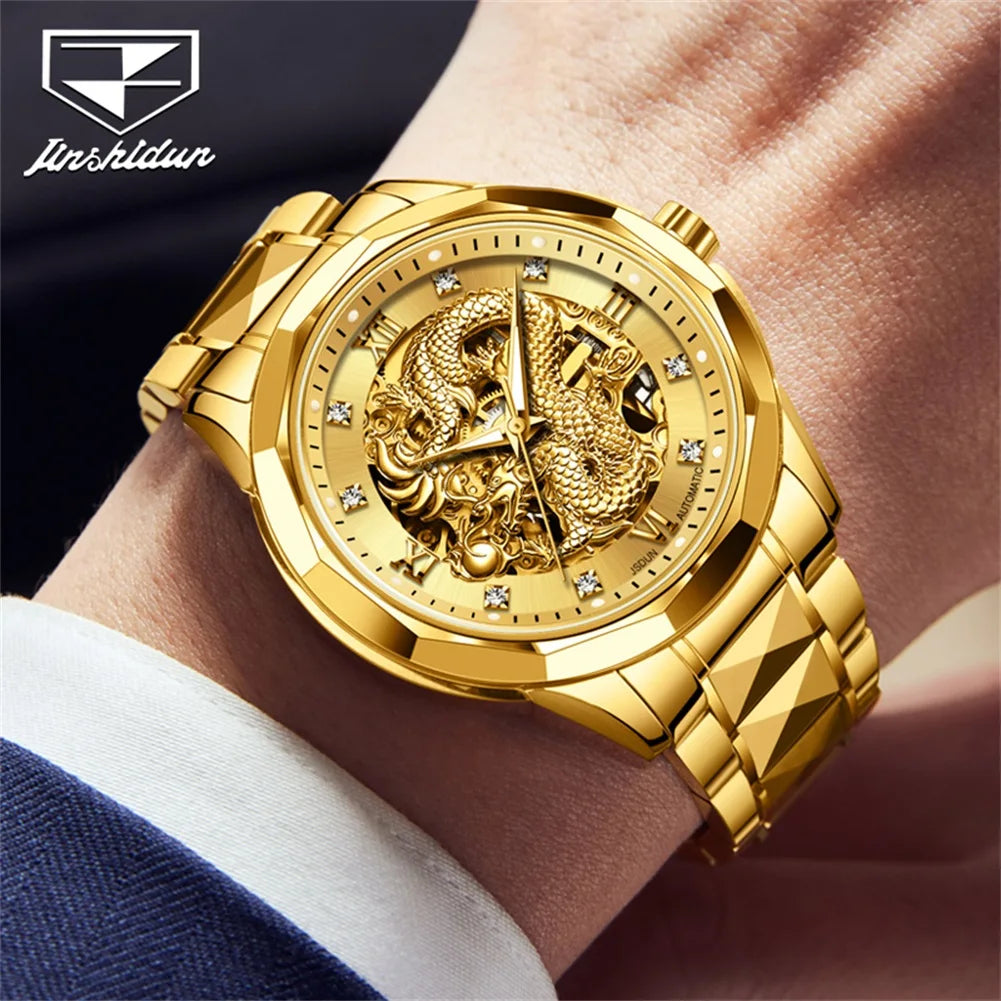 The JSDUN 8840 represents the pinnacle of mechanical watchmaking, combining traditional craftsmanship with contemporary luxury design. This automatic timepiece features intricate all-over dragon carving in hollow gold, creating a striking visual statement that captures light and movement. The diamond-set bezel and case elevate its prestige, while the transparent exhibition caseback reveals the precision of the automatic mechanical movement within. Engineered for discerning collectors, this original men's brand watch delivers both horological excellence and artistic distinction, making it an investment piece that transcends everyday timekeeping.
