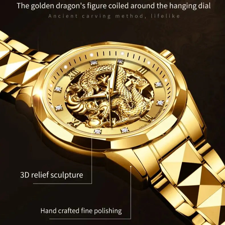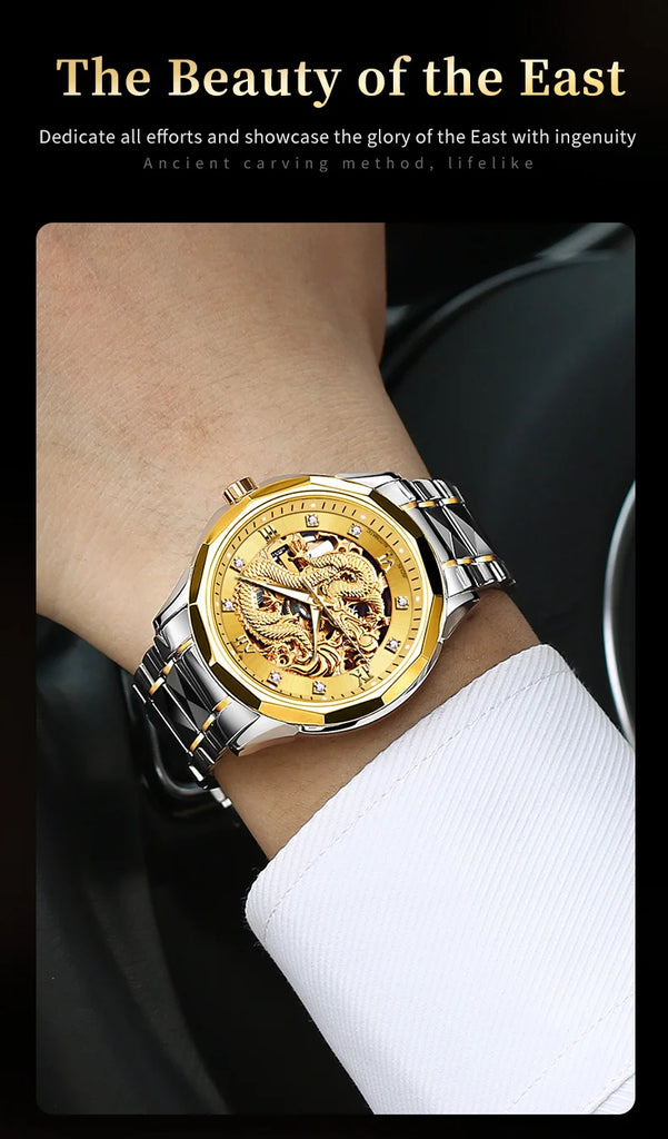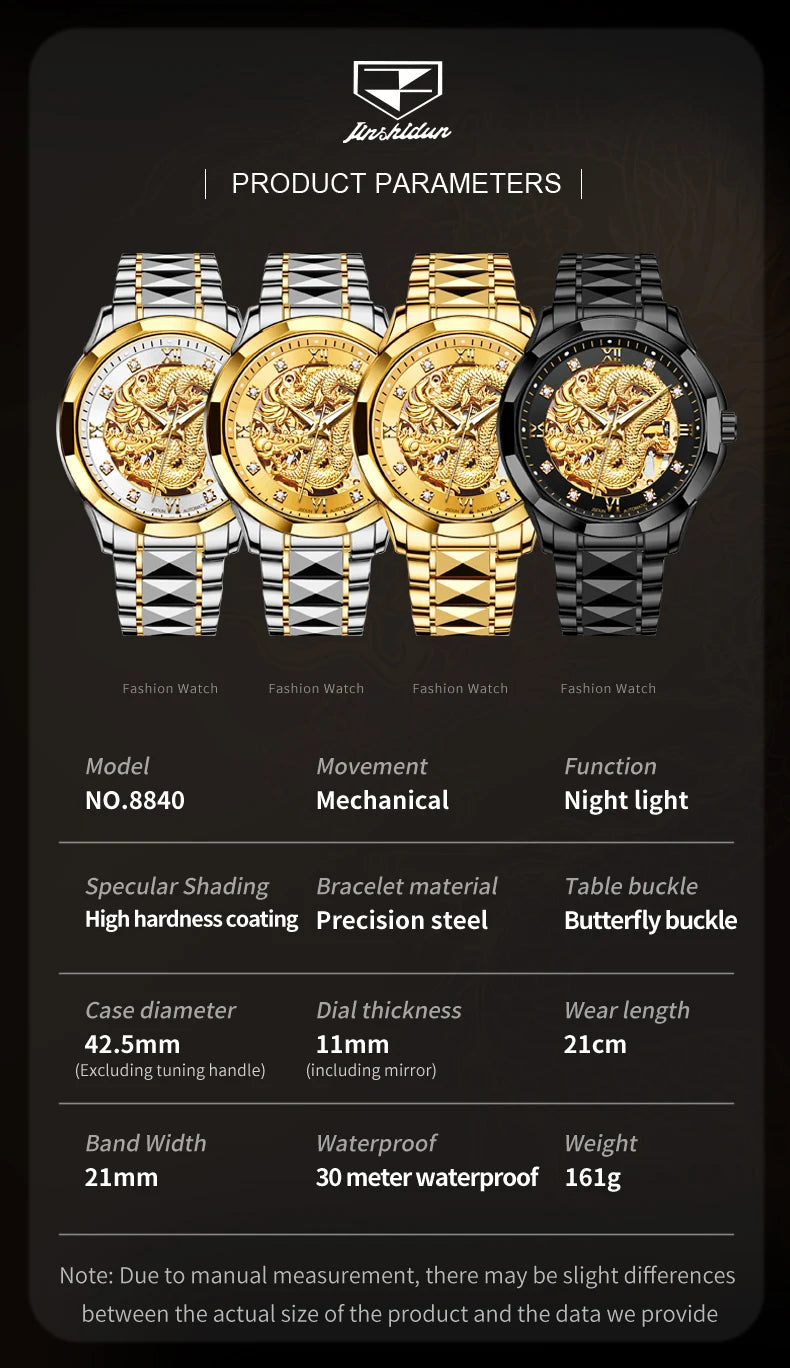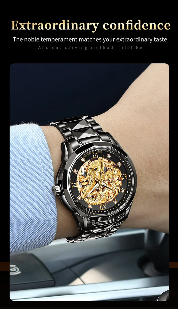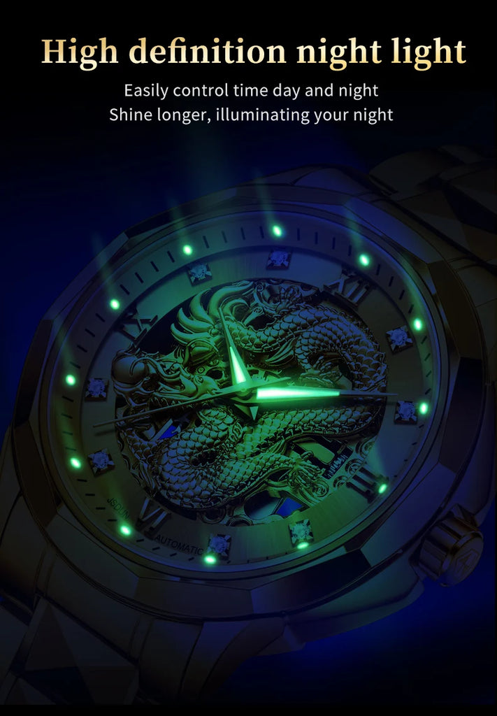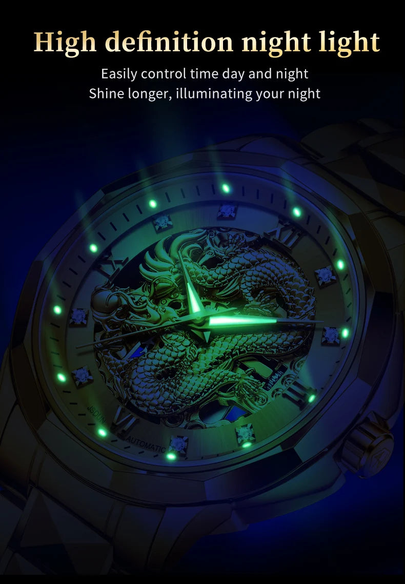 The JSDUN 8840 represents the pinnacle of mechanical watchmaking, combining traditional craftsmanship with contemporary luxury design. This automatic timepiece features intricate all-over dragon carving in hollow gold, creating a striking visual statement that captures light and movement. The diamond-set bezel and case elevate its prestige, while the transparent exhibition caseback reveals the precision of the automatic mechanical movement within. Engineered for discerning collectors, this original men's brand watch delivers both horological excellence and artistic distinction, making it an investment piece that transcends everyday timekeeping.