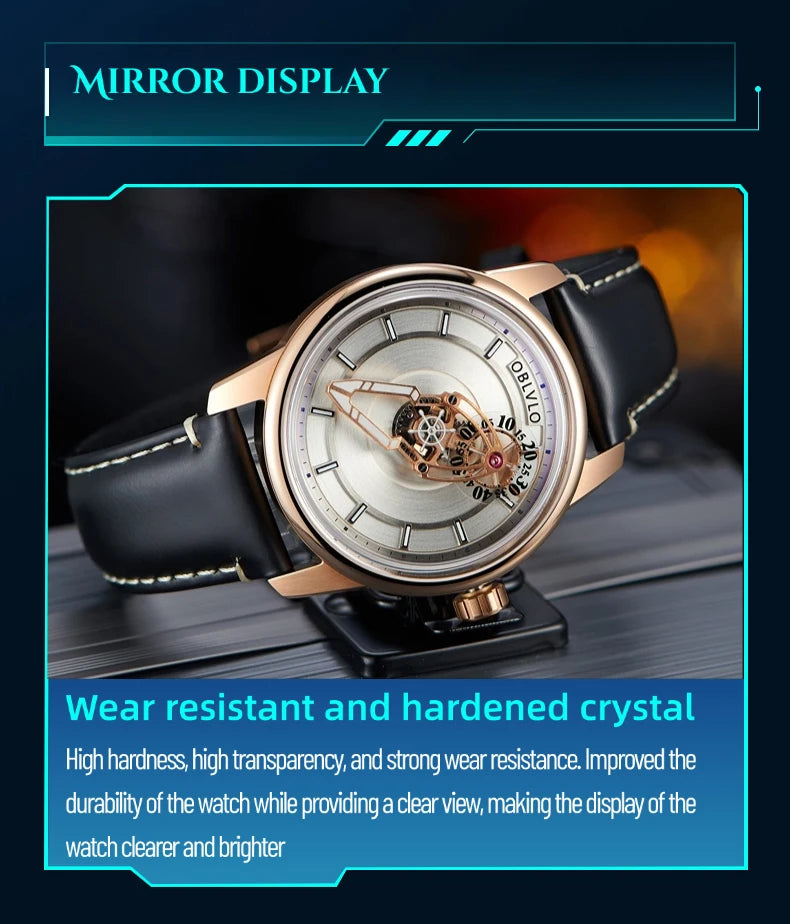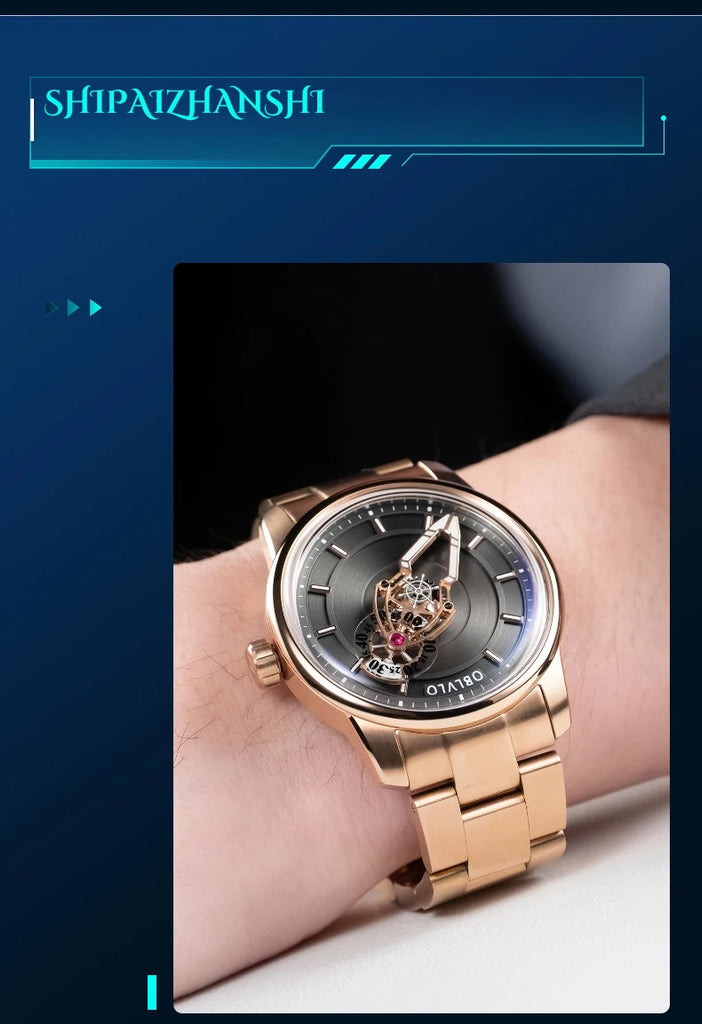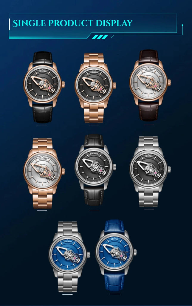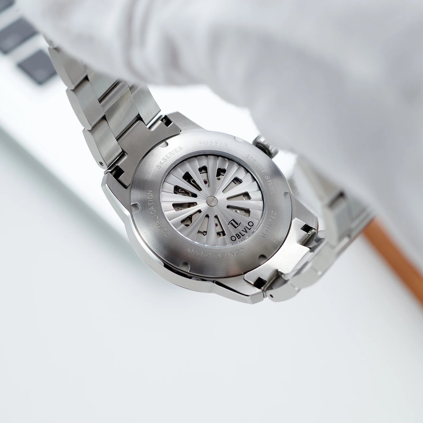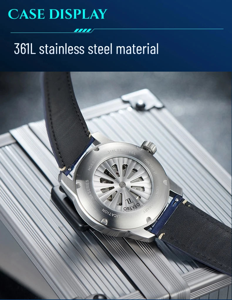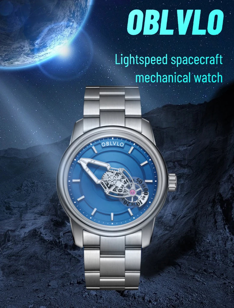 # VOODIEX OBLVLO JM-SP Spacecraft Design Automatic Watch Experience precision engineering with this distinctive timepiece featuring a spacecraft-inspired dial design. The automatic mechanical movement ensures reliable timekeeping without battery dependency, while the stainless steel construction provides durability and corrosion resistance. A luminous dial and hands guarantee visibility in low-light conditions, making this watch practical for any environment. The waterproof casing protects against daily moisture exposure, ideal for active wear. The blue dial offers sophisticated contrast against the polished steel case, creating a striking aesthetic that appeals to collectors and enthusiasts alike. A statement piece that combines technical excellence with bold design.