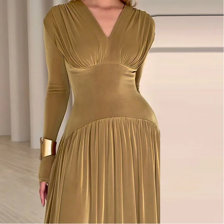 High Waist Long Sleeved Dresses Fashion Women's V Neck Solid Color Velvet Dress