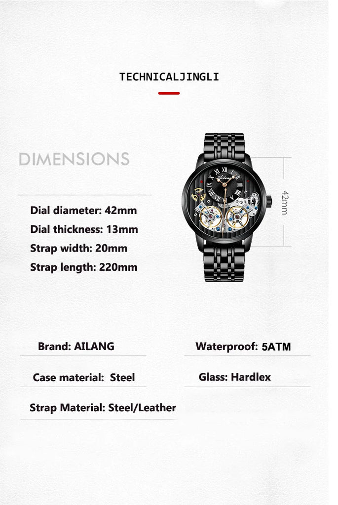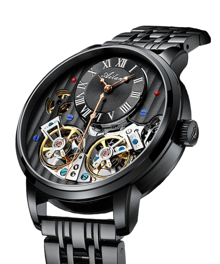 Experience precision and sophistication with the AILANG Luxury Men's Automatic Watch. Featuring a double tourbillon mechanism, this mechanical timepiece delivers exceptional accuracy and smooth performance. Its luminous hands ensure clear visibility in low light, while the waterproof design offers durability for everyday wear. Crafted with meticulous attention to detail, this black dial watch combines elegance and functionality for the discerning collector.