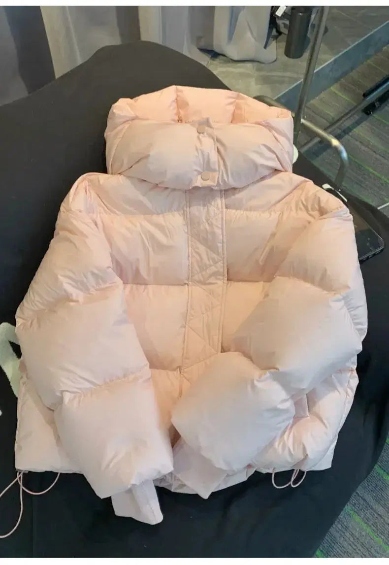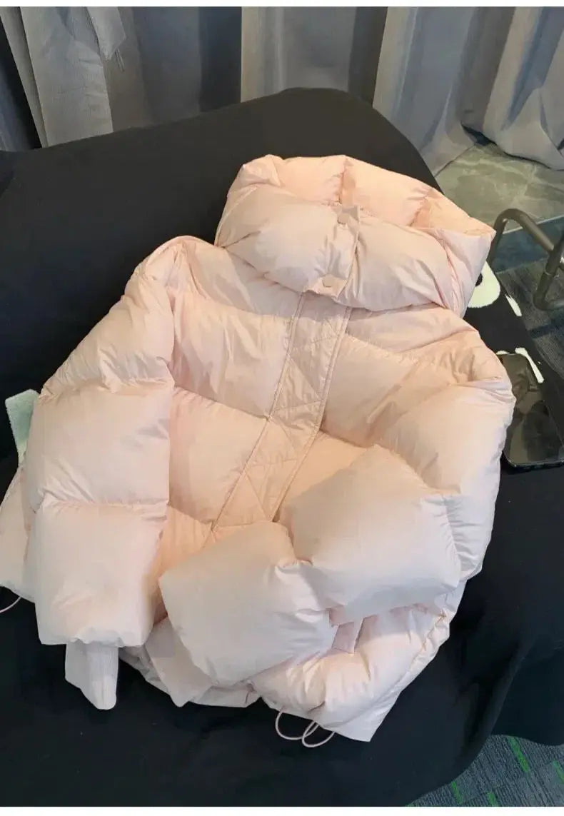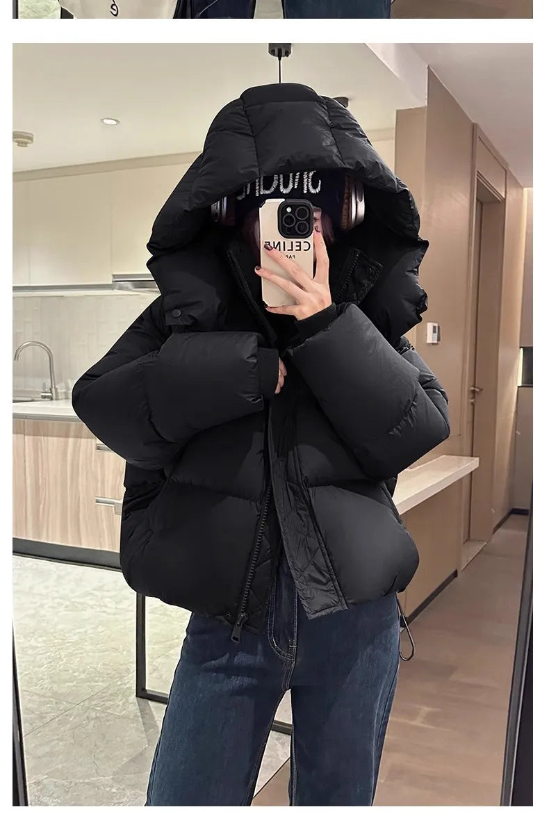 This hooded cotton jacket for women combines warmth and style for winter wear. Crafted with thickened fabric, it offers excellent insulation against cold weather while maintaining comfort. The long sleeves and loose Korean-inspired design ensure a flattering fit and freedom of movement. Its solid color and versatile short length make it easy to pair with various outfits, providing both practicality and a fashionable edge for the colder months.