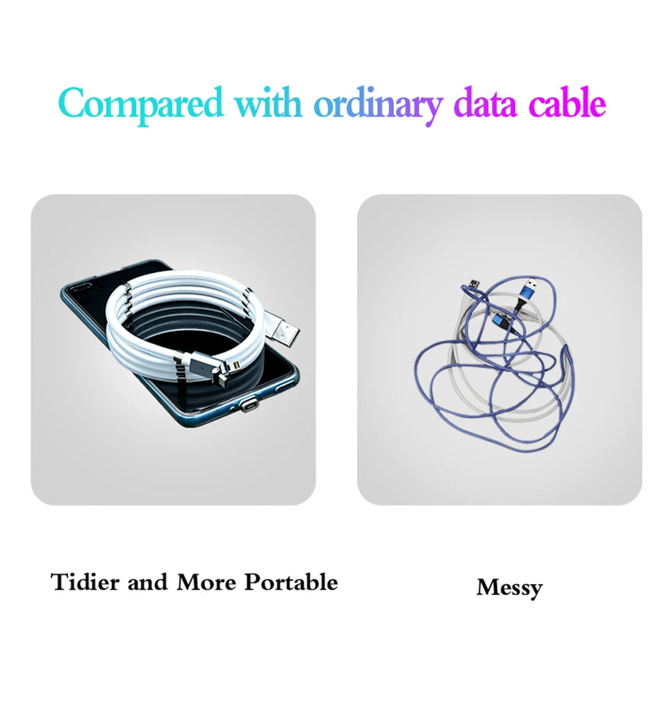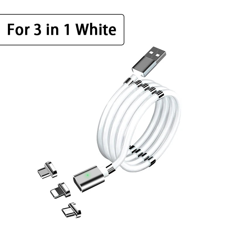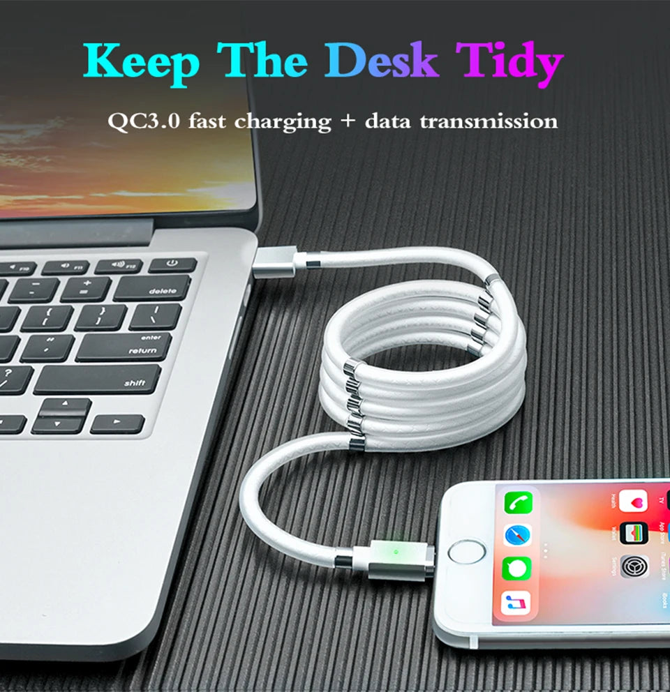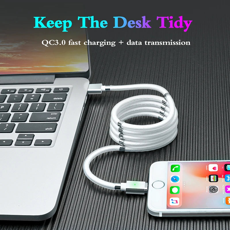 The Magic Rope Magnetic Cable Storage Magnet offers seamless organization and fast charging with QC3.0 support. Featuring a versatile 3-in-1 design, it combines Micro USB, Type-C, and Lightning connectors to charge iPhone, Samsung, Huawei, Xiaomi, and other devices efficiently. Its magnetic storage keeps cables neatly coiled, preventing tangles and damage. Durable and compact, this cable ensures reliable data transfer and power delivery, making it an essential accessory for tech professionals and everyday users alike.