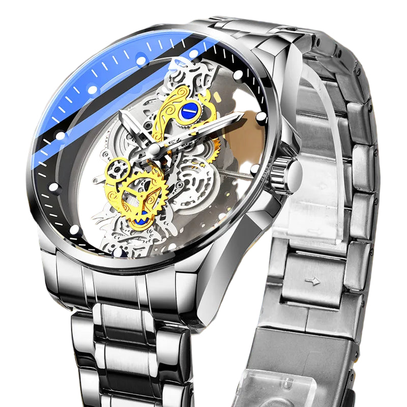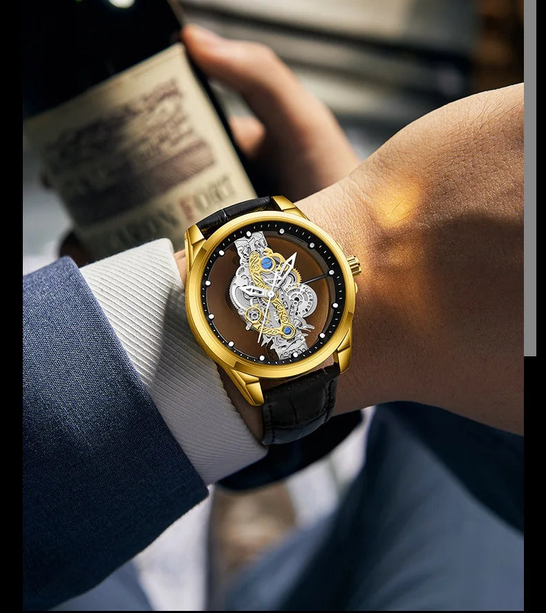 The TIGERAO Men's Quartz Watch features a double-sided transparent hollow design with a luminous gold finish, combining style and functionality. Its waterproof build ensures durability in various conditions, while the precise quartz movement offers reliable timekeeping. Ideal for those seeking a modern, eye-catching accessory with practical resilience.